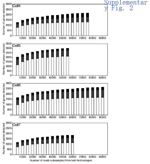 - 7個B1a細胞全長cDNA分別進行二代Illumina轉(zhuǎn)錄組測序(73,086-351,876 150?bp reads/細胞)和三代ONT全長轉(zhuǎn)錄組測序(R 7.3 17,749-52,696/R9.4 57,874-128,726 ONT reads/細胞),二者間進行比較。