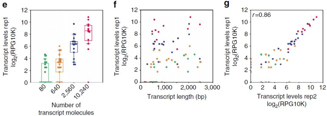 SIRV為已知長度、結(jié)構(gòu)和序列的人工合成的Spike-in RNA對照混合物。當擴增單細胞級痕量RNA時,較低濃度組中的轉(zhuǎn)錄本drop-out(很多未檢出表達),并且轉(zhuǎn)錄本定量顯示每個濃度組內(nèi)的變化(下圖e,橫坐標為4個不同濃度分組)。然而,重要的是,定量不受轉(zhuǎn)錄本長度的影響,除了短于500bp的轉(zhuǎn)錄本(下圖f)。通常,ONT RNAseq定量與Spike-in?轉(zhuǎn)錄物濃度一致,轉(zhuǎn)錄本定量的組內(nèi)變異在重復樣本之間是可重復的(下圖g)。這種組內(nèi)變異可能是由于初始轉(zhuǎn)錄水平、系統(tǒng)擴增偏差或數(shù)據(jù)分析偏差導致。分析這些不同濃度的合成轉(zhuǎn)錄本使作者排除了ONT RNAseq有利于較短轉(zhuǎn)錄本定量的可能性,可對長度為500-2,500 bp的SIRV轉(zhuǎn)錄本進行大規(guī)模無偏倚定量。