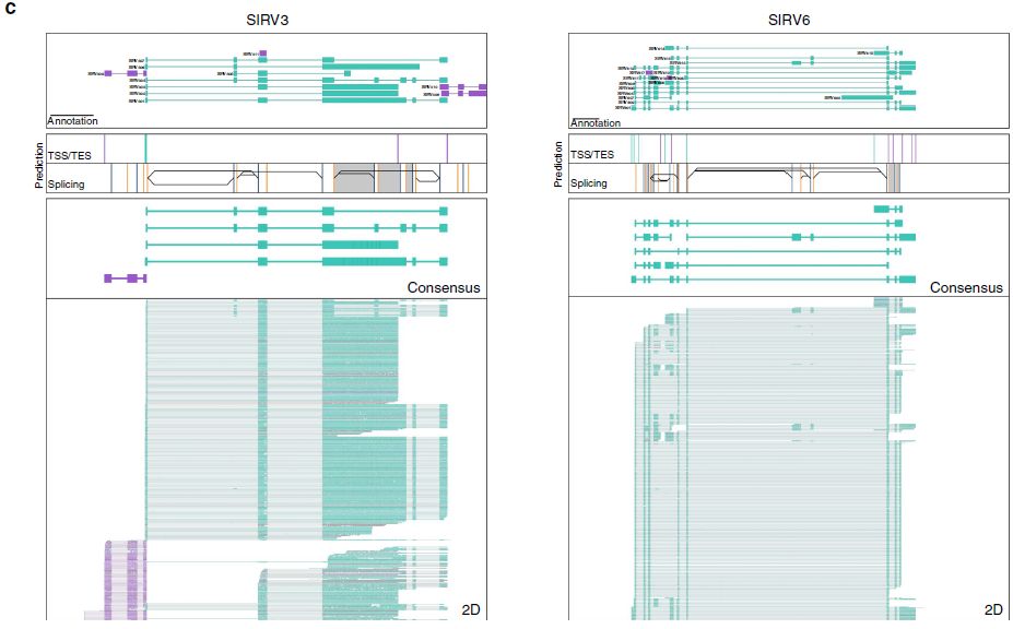 此外,在SIRV基因組注釋中檢測到76個(/89個)5’剪接位點和73個(/93個)3’剪接位點。通過分析ONT reads實際剪接模式,作者檢測到11個(/12個)備選3’剪接位點和12個(/14個)備選5’剪接位點,以及12個(/12個)內(nèi)含子保留事件。