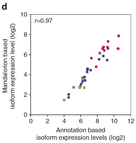 根據(jù)其TSS/TES和可變剪接位點的使用將ONT reads分類為isoform組,并生成一致性序列,共計33個一致性序列,與其對應(yīng)的SIRV轉(zhuǎn)錄本之間具有97.8-100%相似性,且方向一致。26個一致性序列匹配2個高豐度組中存在的29個SIRV轉(zhuǎn)錄本之一(下圖c)。不依賴于基因組注釋的轉(zhuǎn)錄本isoform?Mandalorion分類定量與reads直接與轉(zhuǎn)錄組比對得到的定量結(jié)果之間的高度相關(guān)性(下圖d)。
