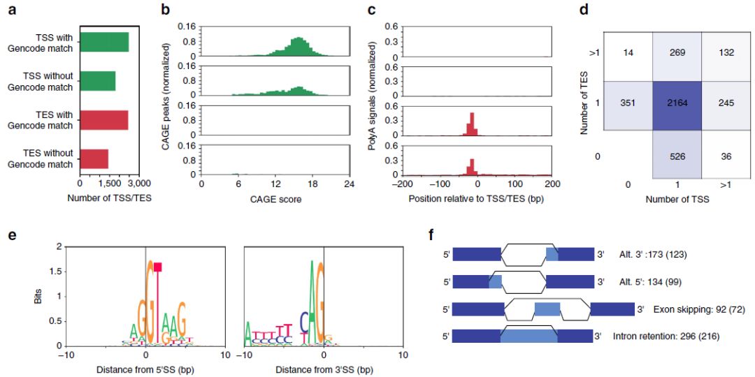 通過對ONT全長轉(zhuǎn)錄組數(shù)據(jù)分析,鑒定到4234個TSS和3883個TES,僅有2476個TSS和2448個TES與小鼠基因組的Gencode數(shù)據(jù)庫(vM10)中存在的TSS或TES重疊。(下圖a)為了確定TSS和TES鑒定的z確性,作者分析了Fantom5數(shù)據(jù)庫中 CAGE peak和polyA信號富集,F(xiàn)antom5 CAGE峰來源于轉(zhuǎn)錄本5’末端的捕獲和測序,因此應(yīng)在TSS中富集。實際上,與TES(49/3883或1.3%)相比,高比例的注釋(2356/2476或95%)和未注釋(1052/1799或58%)TSS與高得分的Fantom5 CAGE峰重疊(下圖b)。相反,注釋和未注釋的TES都高度富集polyA信號,而TSS則沒有(下圖c)。如預(yù)期的那樣,大多數(shù)基因恰好包含一個TSS和一個TES。然而,696個基因含有1個以上的TSS或TES,表明存在一種以上的isoform(下圖d)。總之,單個細胞ONT RNA-seq成功鑒定了數(shù)千個未注釋的TSS和TES以及數(shù)百個具有差異TSS/TES使用的基因。