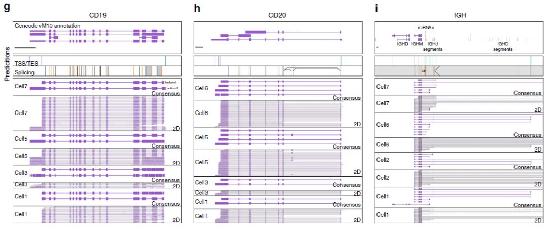 表達復雜isoform的基因定義為:含有可變TSS/TES和可變剪接位點的基因。共計鑒定了169種表達復雜isoform的基因。其中55個基因在細胞之間存在高度顯著差異isoform使用,包括B細胞特異性表面受體CD19和CD20,抗體重鏈基因座(IGH)(下圖g-i),CD37(下圖CD37),以及CD2和CD79b,以及CD45。各個B1a細胞中,來自CD19的同種型顯示出可變TSS和內(nèi)含子保留事件的組合。另一方面,來自CD20的同種型顯示出可選擇性TES的組合,以及包括先前未注釋外顯子的外顯子跳躍事件。IGH基因座更復雜,具有包含VDJ重組和IGHM恒定區(qū)外顯子的典型isoform。觀察到了含有IGHM恒定區(qū)外顯子的isoform,但是源自(1)流產(chǎn)性DJ重組(2)I-外顯子(3)IGHM轉(zhuǎn)換區(qū)miRNA基因座(4)J-區(qū)段。最后,細胞1中的一種isoform來自IGHM I-外顯子,但含有IGHD恒定區(qū)外顯子。雖然之前已觀察到IGH isoform多樣性并且長期以來已知其參與類別轉(zhuǎn)換,但ONT RNAseq在單細胞水平上測序全長cDNA的能力確實突出并證實了?IGH基因座特殊的轉(zhuǎn)錄多樣性。