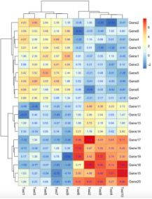為了模擬不同樣品和基因之間的差異,我們將第一行到第10行中奇數(shù)列的數(shù)值全部加3,將第11行到第20行的偶數(shù)列數(shù)值全部加2,將15行到20行的偶數(shù)列全部加4。最后將列名命名為Test1 ~ Test10,將行名命名為Gene1~Gene 20,最終生成的數(shù)據(jù)格式如下圖