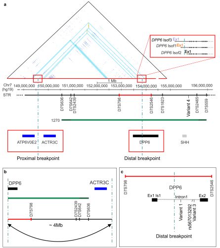 作者設(shè)計引物擴增連鎖區(qū)域去證實這些變異,結(jié)果發(fā)現(xiàn)PCR產(chǎn)物在兩個7號染色體的位點比對到了相反的方向,且距離將近4Mb。7號染色體上的局部比對,證實了反向雜合低拷貝重復的出現(xiàn)。遠端的斷點位于7q36.2連鎖區(qū)域上,DPP6基因的1號內(nèi)含子上,被預測改變了基因的編碼序列;臨近的倒位斷點位于連鎖區(qū)域之外。