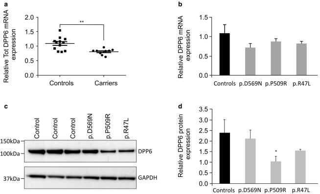 只有3個攜帶DPP6無義突變的患者的解剖大腦被凍存。這三個患者的神經(jīng)病理學診斷分別是阿爾茲海默癥AD,F(xiàn)TLD-TDP typeD(FTD行為變異和佩吉特氏骨?。現(xiàn)TLD-ALS type B(FTD行為變異及球類型)。結(jié)果發(fā)現(xiàn)三個DPP6變異(p.P509R, p.R47L, and p.D596N)?的mRNA表達水平顯著下調(diào),并且發(fā)現(xiàn)p.P509R和p.R47L 攜帶者的DPP6蛋白表達水平也顯著下降。