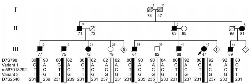 對1270家族的第三代4個患病的兄弟姐妹(III-12,III-38,III-41,III-48)進行WGS測序。選擇4個患者共有的注釋的高質(zhì)量的遺傳變異,罕見的(千人基因組計劃中<1%)或者雜合的非編碼變異進行后續(xù)研究。在STR標記D7S636和D7S559上連鎖區(qū)域的位點保留了79個非編碼的變異。驗證和分離分析保留了38個非編碼變異,這些變異在1270家族的疾病單倍型中共分離。對照個體中的變異的基因型顯示4個變異對于1270家族是唯一的。其中3個變異均位于DPP6基因的1號內(nèi)含子上,另一個變異位于基因間區(qū)(距SHH基因最近,27.3Kb)距離DPP6基因下游908kb。而這四個變異在ENCODE注釋都不具有潛在的高度破壞性。