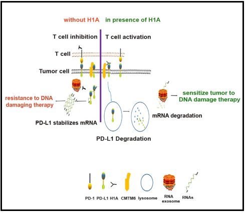 作者研究發(fā)現細胞內PD-L1充當RNA結合蛋白,其調節(jié)NBS1,BRCA1等其他DNA損傷相關基因的mRNA穩(wěn)定性。通過與RNA外切體的競爭,細胞內PD-L1保護靶向RNA免于降解,從而增加細胞對DNA損傷的抗性。RNA免疫沉淀和RNA-seq實驗證明PD-L1在全基因組中調節(jié)RNA穩(wěn)定性。此外,作者開發(fā)了PD-L1抗體H1A,其消除了PD-L1與CMTM6的相互作用(CMTM6可保護PD-L1免受溶酶體降解),從而促進PD-L1降解。細胞內PD-L1可以是通過抑制DNA損傷和修復來增強癌癥中放療和化療功效的潛在治療靶標。