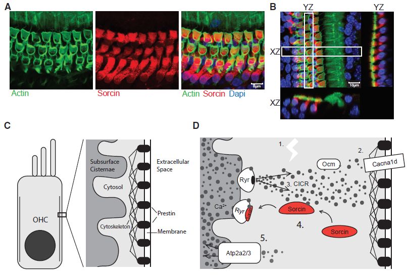 免疫熒光僅將sorcin僅定位于OHC(圖3A,3B),假設(shè)類似的機(jī)制可以調(diào)節(jié)基于prestin的運(yùn)動(dòng)(圖3C和3D,動(dòng)力蛋白?Prestin是一種高度專業(yè)化的蛋白質(zhì),可以起到驅(qū)動(dòng)耳蝸中外部毛細(xì)胞的作用,使耳蝸可以讓人們和動(dòng)物聽到聲音)。與此可能性一致,作者確定了在OHCs中表達(dá)sorcin介導(dǎo)的興奮-收縮途徑的基本組分,包括(1)電壓門控鈣釋放通道,(2)促進(jìn)CICR的通道,(3)終止CICR的機(jī)制(sorcin),和(4)鈣泵使釋放的Ca2+返回Ca2+儲(chǔ)庫(圖3E)。本數(shù)據(jù)集和他人數(shù)據(jù)集中檢測(cè)到的第一個(gè)組分是耳聾基因Cacna1d,一種在OHCs中高表達(dá)的電壓門控鈣釋放通道,參與心動(dòng)過緩有關(guān)的綜合征性耳聾;第二個(gè)組分,即促進(jìn)CICR的通道,包括Ryr1、Ryr2和Ryr3。在通過Ryr通道誘導(dǎo)CICR后,sorcin的作用可能是通過在Ca2+存在下阻斷Ryr受體來快速終止CICR,這是先前在心肌細(xì)胞中報(bào)道的途徑。已知定位于OHC表面下池的Ca2+?ATP酶泵可從細(xì)胞溶質(zhì)中除去Ca2+。附著蛋白質(zhì)(Ocm)等結(jié)合并緩沖Ca2?+的輔助蛋白質(zhì)可能有助于這一過程。