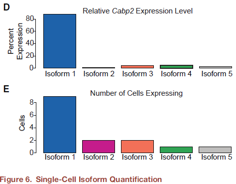 為了解決全長(zhǎng)isoform結(jié)構(gòu),進(jìn)行了ONT全長(zhǎng)轉(zhuǎn)錄組測(cè)序,并使用Illumina短reads序列數(shù)據(jù)作為確認(rèn)的scaffold,用于nonopore長(zhǎng)讀長(zhǎng)數(shù)據(jù)比對(duì)。與150-800bp片段大小的Illumina?reads不同,Nanopore測(cè)序不需要片段化文庫,并且可以產(chǎn)生跨越mRNA轉(zhuǎn)錄本長(zhǎng)度的單一reads(圖6A和6B)。對(duì)p15時(shí)間點(diǎn)的12個(gè)OHC細(xì)胞加barcaod以在4個(gè)MinION?R9.4?flow?cell上測(cè)序所有樣品,同時(shí)保持單細(xì)胞分辨率(圖6A)。因?yàn)镺HCs是最多和最差異的Illumina數(shù)據(jù)集,這有助于跨平臺(tái)比較以驗(yàn)證長(zhǎng)reads和isoform定量。