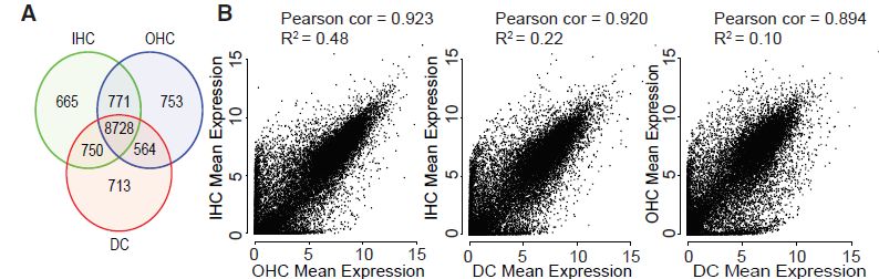為了比較細(xì)胞類型之間表達(dá)譜,計(jì)算各cluster內(nèi)所有細(xì)胞中每個(gè)基因平均表達(dá)水平。通過維恩圖對(duì)平均表達(dá)譜比較,每種細(xì)胞類型約表達(dá)700個(gè)特異基因(OHC-753;?IHC-655;?DC-713;歸一化后counts>10)。且發(fā)現(xiàn)IHCs和DC具有高比例重疊(共享750個(gè)基因,與OHC和DC共享564個(gè)基因相比),但是IHC和OHC共享771個(gè)基因表達(dá)(圖2A)。為了更嚴(yán)格地測(cè)試每種細(xì)胞類型的轉(zhuǎn)錄相似性,使用所有基因進(jìn)行Pearson相關(guān)和R2回歸分析?;貧w分析,所有3組間比較中發(fā)現(xiàn)了強(qiáng)相關(guān)性,OHCs和IHC之間的相關(guān)性最高,OHCs和DC之間的相關(guān)性最低。OHC和DC表達(dá)譜最不相似可能反映了OHC高水平特化(圖2B)。