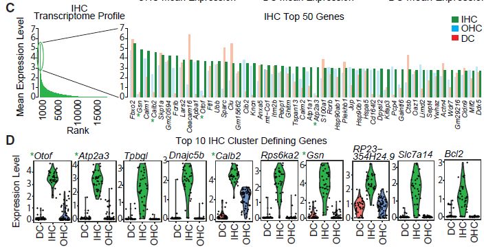 單細(xì)胞RNA-seq可鑒定內(nèi)毛細(xì)胞(inner?hair?cells,IHCs)和外毛細(xì)胞(outlier?hair?cells,OHCs)定義基因;