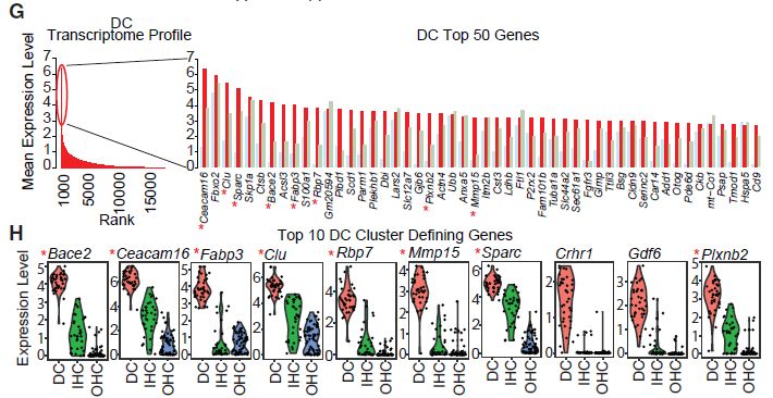 使用Seurat進(jìn)行基于主成分1和2的無偏差聚類(圖1E)。得到的tSNE?clusters顯示IHC、OHC和DC分離明顯,形成與其形態(tài)學(xué)分組一致的無偏細(xì)胞特異性組(圖1F)。為了鑒定每種細(xì)胞類型的特征性表達(dá)模式,在AUC分類器下為每種細(xì)胞類型提取了前100個(gè)cluster定義基因(圖1G)。