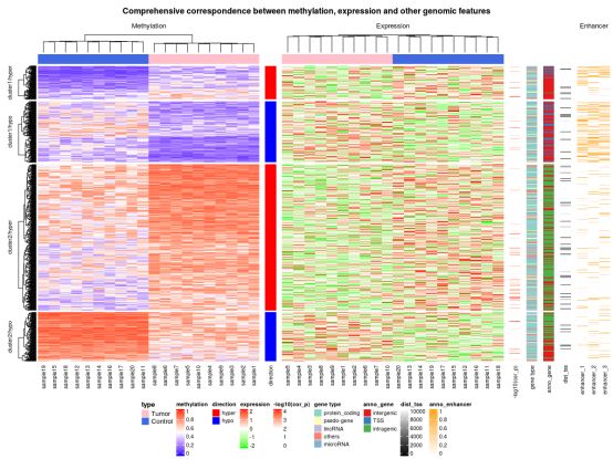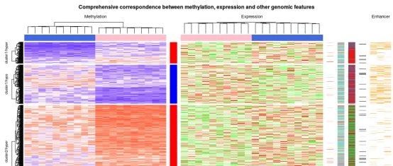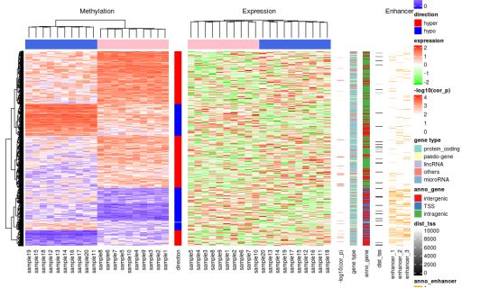 本次,我們將展示一個甲基化與表達譜聯(lián)合分析的熱圖。本著先學習再創(chuàng)造的態(tài)度,小編做了一下知識的搬運工,本篇所有代碼均引用自:Zuguang Gu, Roland Eils and Matthias Schlesner,?Complex heatmaps reveal patterns and correlations in multidimensional genomic data,?Bioinformatics, 2016。