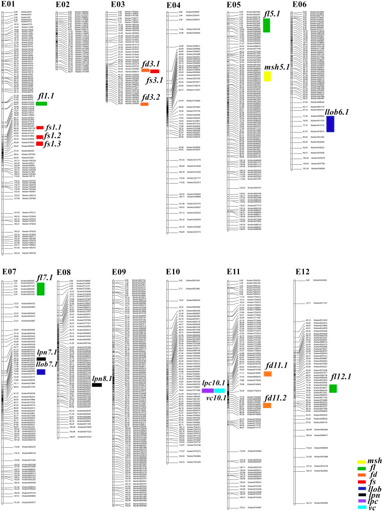FL定位到4個QTL,即fl1.1, fl5.1, fl7.1, 與fl12.1,分別位于LG1,5,7,12上。最主效的QTL為fl12.1,可解釋24.05% 的表型變異,其次為fl1.1與fl5.1(PVE為12.00與13.06%),貢獻(xiàn)率最低的為fl7.1(PVE僅為4.08%),此外,在fl5.1中鑒定到11個SNPs。這4個QTLs中,除fl12.1的標(biāo)記Marker8964317遠(yuǎn)離其它兩個相鄰的標(biāo)記外,其它QTL標(biāo)記均處于合理的距離。