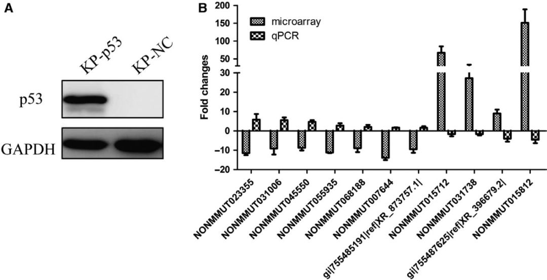 p53是臨床肺癌中最常見(jiàn)的突變抑癌基因,在我們的肺腺癌小鼠模型和KP細(xì)胞中均被誘導(dǎo)完全敲除。因此,作者探索了所選擇的210個(gè)保守的lncRNAs的非調(diào)控表達(dá)是否與p53的缺失有關(guān)。攜帶p53基因的慢病毒顆??稍贙P細(xì)胞中重新表達(dá)p53。如下圖A所示,p53在穩(wěn)定感染的KP細(xì)胞中有效地重新表達(dá)。qPCR結(jié)果顯示,p53再表達(dá)顯著改變了11個(gè)lncRNAs的表達(dá)(FC≥1.5),且差異倍數(shù)與上述p53缺失的肺腺癌組織芯片數(shù)據(jù)相反(圖B),表明p53的再表達(dá)對(duì)LncRNAs的表達(dá)有顯著影響。