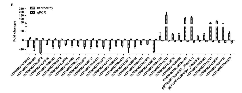 在已鑒定的lncRNAs中,NONMMUT015812非常有趣。(a)其在小鼠肺腺癌組織中的表達(dá)增加約150-187倍。(b)其表達(dá)與p53呈負(fù)相關(guān)。(c) NONMMUT015812基因位于反轉(zhuǎn)錄轉(zhuǎn)座子樣蛋白1基因和甲狀腺素5-脫碘酶基因之間的染色體上,其中包含幾個(gè)在人和小鼠中表達(dá)差異的lncRNAs。
