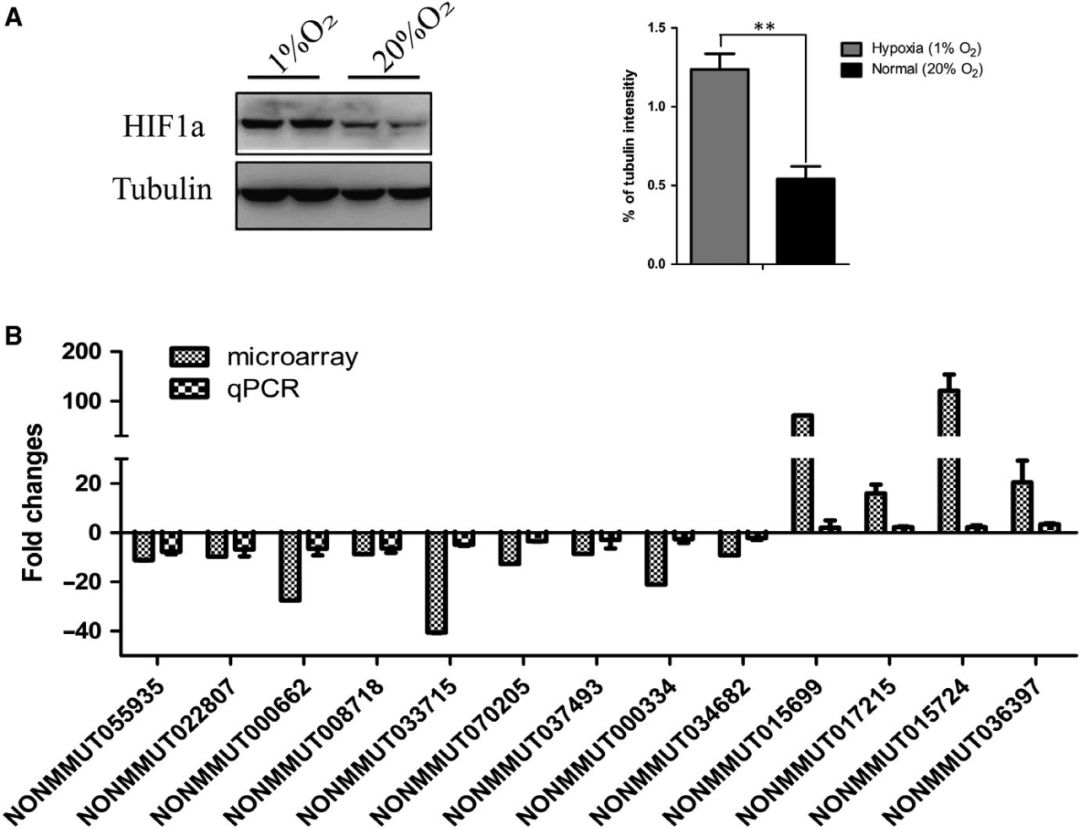 缺氧是實(shí)體腫瘤的一個(gè)顯著特征,低氧腫瘤通常對(duì)傳統(tǒng)的癌癥治療有抵抗力,且腫瘤低氧與晚期惡性腫瘤和轉(zhuǎn)移相關(guān)。作者進(jìn)一步研究了低氧調(diào)節(jié)的潛在的lncRNAs。將KP細(xì)胞在常氧(20% O2)和缺氧(1% O2)中培養(yǎng)48h,WB結(jié)果顯示缺氧可有效上調(diào)KP細(xì)胞HIF1α的表達(dá)(圖A)。RT-PCR結(jié)果顯示,缺氧誘導(dǎo)的KP細(xì)胞中有13個(gè)lncRNAs表達(dá)下調(diào),4個(gè)lncRNAs在缺氧誘導(dǎo)下表達(dá)上調(diào),其表達(dá)變化方向與小鼠肺腺癌組織芯片中的表達(dá)變化方向一致(圖B)。