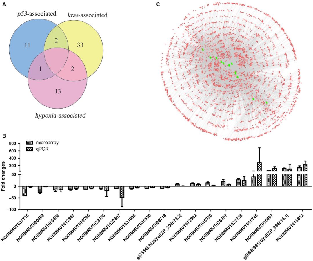 Kras在肺腺癌小鼠模型和KP細(xì)胞中被激活,為了確定與Kras基因相關(guān)的lncRNAs的表達(dá)量,利用Crispr/Cas9敲除其在KP細(xì)胞中的表達(dá)。qPCR結(jié)果顯示,Kras基因缺失改變了33個(gè)lncRNAs的表達(dá)(FC≥1.5),且差異倍數(shù)與Kras被激活的肺腺癌組織芯片數(shù)據(jù)相反(圖B)。
