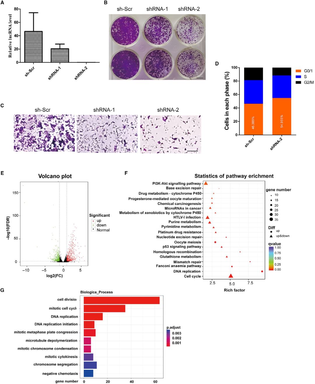 RNA-seq檢測(cè)NONMMUT015812基因敲除細(xì)胞基因表達(dá)的變化。與陰性對(duì)照相比,共鑒定出1281個(gè)差異表達(dá)基因。在這些基因中,610個(gè)基因表達(dá)上調(diào),671個(gè)基因表達(dá)下調(diào)(圖E)。KEGG通路分析表明,NONMMUT015812的下調(diào)影響了幾個(gè)與細(xì)胞生長(zhǎng)相關(guān)的通路,包括細(xì)胞周期、DNA復(fù)制和PI3K/Akt信號(hào)通路(圖F)。有趣的是,KEGG通路的富集還包括p53信號(hào)通路和幾條DNA修復(fù)通路,這意味著NONMMUT015812可能是p53通路的重要下游調(diào)節(jié)因子。與流式細(xì)胞儀分析結(jié)果一致,未發(fā)現(xiàn)凋亡信號(hào)通路。GO分析還表明,許多差異表達(dá)基因主要集中在細(xì)胞分裂、有絲分裂細(xì)胞周期和DNA復(fù)制過(guò)程中。