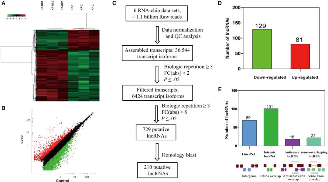 使用芯片技術(shù)檢測(cè)lncRNA,差異表達(dá)lncRNAs的散點(diǎn)圖和聚類圖顯示了肺腺癌和正常肺樣本之間有明顯區(qū)別(圖A、B)。重點(diǎn)研究了在人和鼠之間具有較高差異倍數(shù)且保守的lncRNAs,當(dāng)FC>8,P<0.05時(shí),鑒定到729個(gè)lncRNA。根據(jù)染色體位置保守性和序列保守性,篩選出210個(gè)具有潛在人類同源物的lncRNA用于后續(xù)驗(yàn)證,其中129個(gè)上調(diào),81個(gè)下調(diào)(圖C、D)。根據(jù)其基因組位置,將210個(gè)lncRNA分為u(基因間)、i(內(nèi)含子)、x(反義)和o(正義重疊)四大類。已鑒定的lncRNAs大部分屬于i類,有101個(gè)(48.09%)(圖E)。
