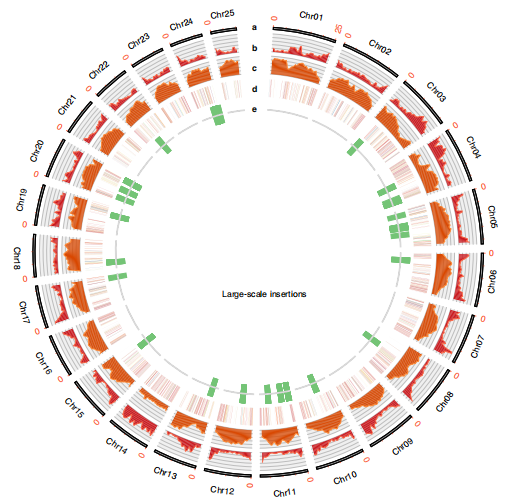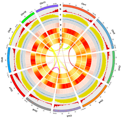 2018年5月8日,中國農(nóng)業(yè)科學(xué)院棉花研究所所長李付廣研究員、武漢大學(xué)朱玉賢院士、中國農(nóng)業(yè)科學(xué)院棉花研究所杜雄明研究員、中國農(nóng)業(yè)科學(xué)院農(nóng)業(yè)基因組研究所所長黃三文研究員、林濤博士與北京百邁客生物科技有限公司關(guān)于亞洲棉的合作成果發(fā)表在Nature Genetics上。利用三代PacBio測序+Hi-C技術(shù)完成了亞洲棉基因組的重新組裝,將基因組Contig N50從72 kb提升到1.1 Mb,并將91.98%的序列掛載至染色體水平上,為亞洲棉后續(xù)的群體遺傳學(xué)等相關(guān)研究奠定了基礎(chǔ)[5]。