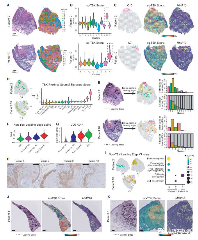 在患者中,腫瘤相關(guān)的斑點(diǎn)簇展現(xiàn)出單細(xì)胞測(cè)序腫瘤KCs的定位基因表達(dá),同時(shí)免疫或間質(zhì)基因與腫瘤臨近間質(zhì)、未受累的間質(zhì)或附件區(qū)域有關(guān)聯(lián),與大體的cSCC結(jié)構(gòu)一致(圖3A)。使用scRNA-seq中TSK標(biāo)記基因?qū)γ總€(gè)空間轉(zhuǎn)錄組斑點(diǎn)評(píng)分,顯著突出了一個(gè)TSK-high簇,包括TSK標(biāo)記物MMP10(圖3B&C)。在具有清晰前沿的腫瘤中,TSK鄰近間質(zhì)富集了癌癥相關(guān)成纖維細(xì)胞 (CAF)和內(nèi)皮細(xì)胞轉(zhuǎn)錄本,表明TSK細(xì)胞主要位于纖維血管微環(huán)境中(圖3D)。超過80%的TSK高簇點(diǎn)位于腫瘤前沿,其余的前沿點(diǎn)富集了Basal腫瘤基因(圖3E&F),這種共存關(guān)系通過共表達(dá)標(biāo)志物COL17A1的免疫組化得到進(jìn)一步確認(rèn)(圖3G&H)。此外,炎癥反應(yīng)和干擾素信號(hào)基因在非TSK前沿表達(dá),與干擾素相關(guān)轉(zhuǎn)錄本在腫瘤基底群體中的存在一致(圖2E&I)。這些結(jié)果確定了TSK、Basal細(xì)胞以及TSK近端纖維血管生態(tài)位造成的cSCC腫瘤前沿的異質(zhì)性。