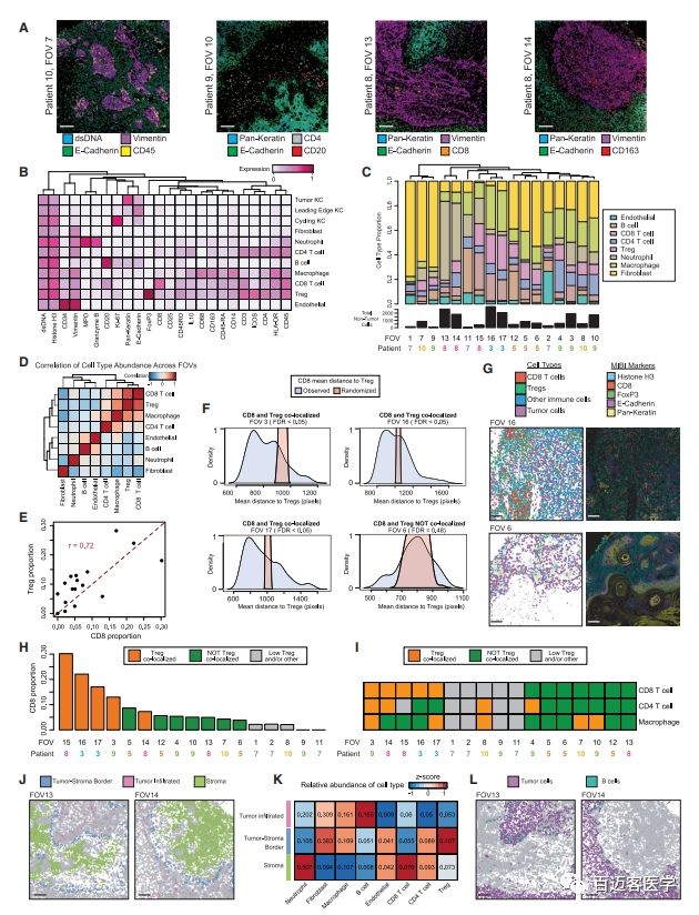 利用多重離子束成像(MIBI)技術(shù),在單細(xì)胞分辨率下解析TME的空間組織。我們對(duì)6例患者的腫瘤前緣進(jìn)行了18個(gè)視野的MIBI掃描,對(duì)38個(gè)腫瘤和基質(zhì)/免疫蛋白標(biāo)志物圖像進(jìn)行分段,確定了55832個(gè)細(xì)胞(圖5A),并且聚類分析的主要細(xì)胞類型與scRNA-seq細(xì)胞類型相似(圖5B)。間質(zhì)和免疫組分在腫瘤內(nèi)和腫瘤間是可變的,12/17的腫瘤患者圖像聚類不一致(圖5C)。腫瘤內(nèi)外的CD8 T細(xì)胞、Tregs、巨噬細(xì)胞和CD4 T細(xì)胞存在高度相關(guān)性,尤其前兩者更甚(圖5D)。5/12視野具備足夠的細(xì)胞進(jìn)行系統(tǒng)分析CD8 T細(xì)胞和Tregs距離(圖5F-H),我們發(fā)現(xiàn)了兩者的共定位,并且CD8 T細(xì)胞的比例也與共定位呈正相關(guān),表明Tregs受到TME的共招募和CD8 T細(xì)胞的共定位共同調(diào)節(jié),另外CD4 T細(xì)胞和巨噬細(xì)胞與Tregs共定位(圖5I)。成纖維細(xì)胞、巨噬細(xì)胞和Tregs在腫瘤-間質(zhì)邊緣最豐富,而CD8 T細(xì)胞和中性粒細(xì)胞被大量排除在腫瘤之外,表明 Treg 定位可能阻止效應(yīng)淋巴細(xì)胞進(jìn)入腫瘤(圖5J&K)。已經(jīng)被發(fā)現(xiàn)可以介導(dǎo)免疫抑制或抗腫瘤活性B細(xì)胞是唯一表現(xiàn)出優(yōu)先浸潤的細(xì)胞類型。