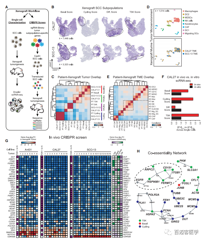 接下來,使用CRISPR/Cas9技術(shù)對(duì)3個(gè)鱗狀細(xì)胞癌移植瘤株進(jìn)行篩選(4個(gè)亞群,334個(gè)富集基因),評(píng)估腫瘤KC亞群的功能作用(圖7A)。通過STARS算法,獲得38個(gè)命中點(diǎn),其中18個(gè)至少被兩種細(xì)胞系共享(圖7F)。特別的,對(duì)腫瘤生長重要的基因偏向于在TSK、基底和循環(huán)細(xì)胞中表達(dá)。腫瘤循環(huán)KCs特有的參與細(xì)胞循環(huán)的基因形成了以PCNA和GINS2為中心的最大網(wǎng)絡(luò)。最大的TSK特異性網(wǎng)絡(luò)包括ITGB1、FERMT1、CD151、ARPC2、HSP90B1。ITGB1、CD151和 FERMT1的蛋白產(chǎn)物在細(xì)胞表面相互作用,介導(dǎo)整合素信號(hào)。通過體外實(shí)驗(yàn)驗(yàn)證ITGB1、FERMT1和CD151對(duì)腫瘤生長的重要性低于體內(nèi),證實(shí)了如果整合素信號(hào)介導(dǎo)與TME的通訊,相關(guān)基因在體內(nèi)腫瘤發(fā)生中應(yīng)該比在體外有更大的依賴性的推斷。綜上,體內(nèi)異種移植篩查結(jié)合TCGA分析突出了可能控制亞群特異性致瘤功能的關(guān)鍵基因。