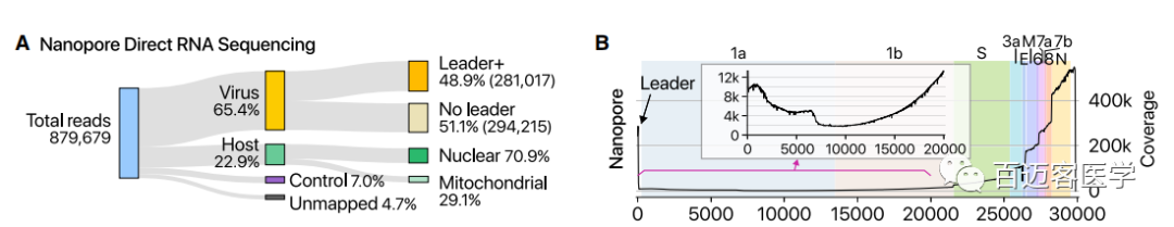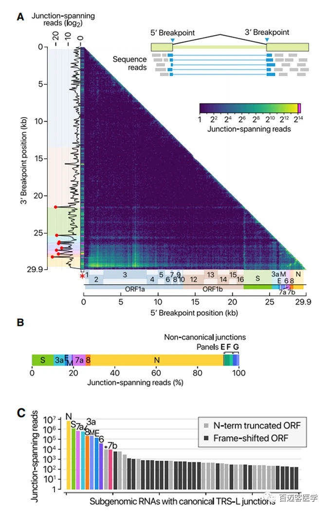 這篇文章結(jié)合了兩種測序方法,Direct RNA sequencing (DRS)和sequencing-by-synthesis (SBS),明確地繪制了SARS-CoV-2的亞基因組RNA(subgenomic RNAs),ORF和轉(zhuǎn)錄調(diào)控序列(TRS)。同時發(fā)現(xiàn)了許多與常規(guī)TRS介導(dǎo)的聚合酶跳躍不同的非常規(guī)RNA融合事件。發(fā)現(xiàn)了RNA修飾位點,并測量了gRNA和sgRNA的poly(A)的長度。