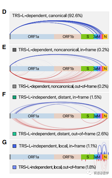 SARS-CoV-2除了具有預(yù)期結(jié)構(gòu)和長度的經(jīng)典sgRNA(圖4D),結(jié)果還顯示出許多次要的junction sites(圖4E–4G)。這種融合事件有三種主要類型。第一組中的RNA在位于ORF或UTR中間非預(yù)期的3’位點,前導(dǎo)序列(leader)與下游編碼序列(body)結(jié)合(圖4E,TRS-L-dependent noncanonical)。第二組顯示了與前導(dǎo)序列沒有相似性的序列之間的遠(yuǎn)距離融合(圖4F, TRS-L-independent distant)。最后一組局部融合,這導(dǎo)致較小的缺失,主要發(fā)生在結(jié)構(gòu)基因和輔助基因中,包括S ORF(圖4G,TRS-L-independent local recombination)。