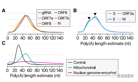 由于納米孔DRS基于RNA的單分子檢測,因此它提供了獨特的機會來檢查單個RNA分子的多個轉(zhuǎn)錄組特征。本文使用自己開發(fā)的軟件根據(jù)DRS數(shù)據(jù)來測量ploy(A)尾的長度(Y. Choi and H.C., unpublished data)。使用此軟件測量發(fā)現(xiàn),與其他CoV一樣,SARS-CoV-2 RNA帶有ploy(A)尾(圖5A–5B)。病毒RNA尾的中位長度為47 nt。全長gRNA的尾巴比sgRNA更長。值得注意的是,sgRNA具有兩個種群:一個在30 nt處的小峰和一個在45nt處的主峰(圖5B,箭頭)。之前研究發(fā)現(xiàn) bovine CoV mRNA的ploy(A)尾長度在感染過程中發(fā)生了變化,在這項研究中觀察到的30 nt的短尾可能代表易于衰變的老化RNA。與宿主核基因組編碼的mRNA不同,病毒RNA具有均勻的長度分布(圖5C)。