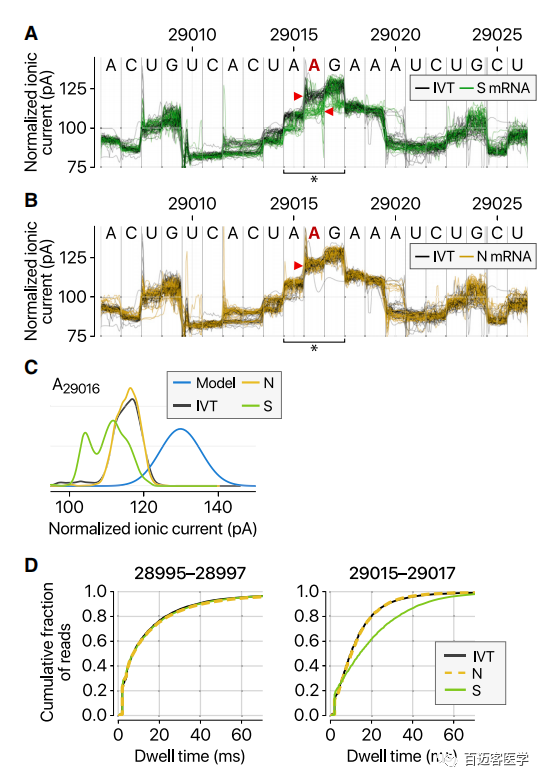 研究人員用DRS數(shù)據(jù)檢測了SARS-CoV-2的表觀轉(zhuǎn)錄組學(xué)。病毒RNA修飾在40多年前就已描述過(Gokhale and Horner,2017)。為了明確研究RNA修飾,作者通過體外轉(zhuǎn)錄病毒序列生成了陰性對照RNA,并對陰性對照進(jìn)行了直接RNA測序。注意到陰性對照和病毒轉(zhuǎn)錄本之間的離子電流之間的差異非常有趣(圖6A)。至少有41個位點顯示出實質(zhì)性差異(頻率超過20%),表明存在潛在的RNA修飾位點。值得注意的是,某些位點顯示的頻率取決于sgRNA的種類。圖6A–6C,S RNA上比N RNA修飾的位點更多,與S RNA相比ORF8 RNA上的修飾頻率更高。此外,修飾的堿基(圖6D,右)的停留時間比未修飾的堿基(圖6D,左)的停留時間長,表明修飾會干擾RNA分子過孔速度。