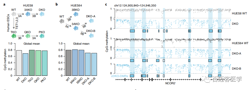 尚無研究直接比較喪失所有去甲基酶和甲基轉(zhuǎn)移酶化對轉(zhuǎn)錄和基因組調(diào)控以及細(xì)胞活性的影響。為了檢查去除所有DNA甲基化活性調(diào)節(jié)蛋白的分子后果,作者生成了在DNMT3A和-3B以及所有3個(gè)TET蛋白均缺失的五元敲除( pentuple-knockout,PKO)人類ESC進(jìn)行相關(guān)研究。