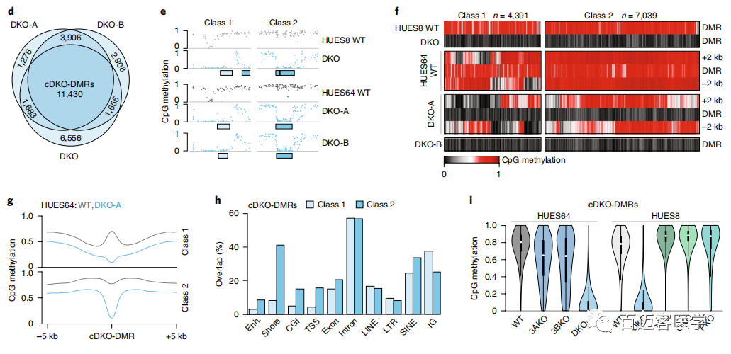 為了進(jìn)一步研究這種甲基化缺失,接下來從另一個(gè)人類ESC系(HUES64)(包括2個(gè)獨(dú)立的DKO克隆(A和B))WT和DKO細(xì)胞進(jìn)行了甲基化測序,并將甲基化水平與先前衍生的18個(gè)單DNMT3A-/-(3AKO)和單DNMT3B-/-(3BKO)敲除數(shù)據(jù)作比較(圖1b)。兩種不同的雄性WT ESC似乎具有可比性,具有相似的整體甲基化平均值(HUES64,0.79;HUES8,0.78),并且在1kb分辨率上具有較高的相關(guān)性(Pearson系數(shù)=0.93)。有趣的是,盡管第22代的單DNMT3基因敲除仍保持高度甲基化(3AKO,0.81;3BKO,0.79),但2個(gè)HUES64 DKO克隆僅經(jīng)過3代后甲基化降低至0.70(圖1b)。當(dāng)我們以堿基對的分辨率檢查數(shù)據(jù)時(shí),觀察到2個(gè)不同的動(dòng)態(tài)類別:0.1-0.2的細(xì)微下降,影響了整個(gè)基因組范圍內(nèi)約10%的CpG,以及,在CpG島內(nèi)局部發(fā)生的甲基化幾乎完全喪失的CpG位點(diǎn)(圖1c)。使用嚴(yán)格的標(biāo)準(zhǔn)(甲基化差異> 0.6,P <0.01,F(xiàn)檢驗(yàn))來定義差異甲基化區(qū)域(DMR)。DKO-DMR在3個(gè)DKO譜系上都非常一致(圖1c,d)。因此,定義了在所有3個(gè)樣品中均被甲基化的“一致性”的11,430個(gè)cDKO-DMR,cDKO-DMR始終保持較低水平(平均WT,0.749;DKO,0.086),平均長度為688個(gè)堿基對(bp)。WT ESC中大約三分之一cDKO-DMR鄰近低甲基化區(qū)域,例如CpG島和轉(zhuǎn)錄起始位點(diǎn)(稱為“1類”),而其余的cDKO-DMR則位于其他高度甲基化的區(qū)域(內(nèi)含子或基因間),具有明顯的高甲基化邊界(稱為“第2類”;圖1e–h)。幾乎所有的cDKO-DMR(93%)都被DNMT3A或-3B甲基化,僅在DKO中被完全去甲基。
