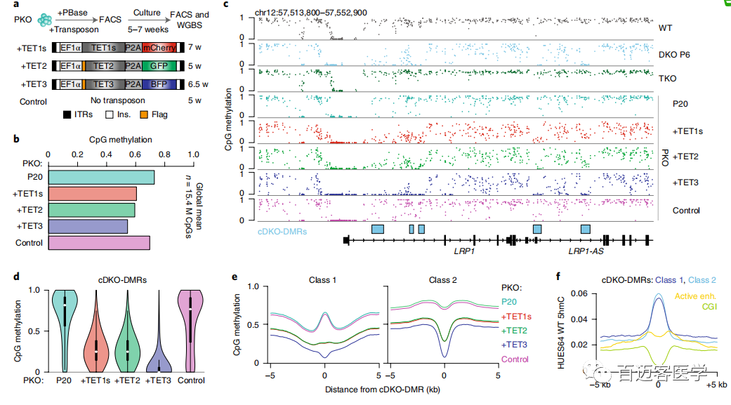 為了驗(yàn)證cDKO-DMR是否依賴并持續(xù)誘導(dǎo)TET活性,利用PiggyBac轉(zhuǎn)座將外源TET1(短isoform簡稱TET1s)、TET2和TET3重新引入PKO細(xì)胞中,并使用WGBS測量了總體甲基化水平(圖2a)。在異位表達(dá)每種蛋白質(zhì)后,PKO細(xì)胞的總體平均甲基化水平從第20代的0.73明顯降低到了異位表達(dá)每種蛋白質(zhì)后的0.61、0.59和0.54,而僅用轉(zhuǎn)座酶轉(zhuǎn)染的對照細(xì)胞保持穩(wěn)定(平均值=0.70;圖2b)。重新引入任何TET酶可在很大程度上恢復(fù)TKO細(xì)胞中異常高甲基化的區(qū)域,誘導(dǎo)快速的cDKO-DMR去甲基化(圖2c-e)。從機(jī)理的角度來看,TET1s亞型缺乏CXXC結(jié)構(gòu)域,無法募集至未甲基化的CpG密集區(qū)域,但TET1和TET2 rescue結(jié)果之間無明顯差異,支持了CXXC結(jié)構(gòu)域無關(guān)的募集機(jī)制。TET及其作用相反的酶在cDKO-DMRs上的持續(xù)動(dòng)態(tài)也得到了已發(fā)表的染色質(zhì)免疫沉淀的支持,隨后進(jìn)行ChIP-seq,該數(shù)據(jù)表明WT ESC中DNMT3B和TET1均富集,盡管富集在比相當(dāng)狹窄且定義明確的cDKO-DMR邊界更寬區(qū)域。最后,進(jìn)行了全基因組氧化亞硫酸氫鹽測序(oxBS),并在WT細(xì)胞中發(fā)現(xiàn)了5hmC的顯著局部富集(平均cDKO-DMRs,0.07;背景,0.01;圖2f)。