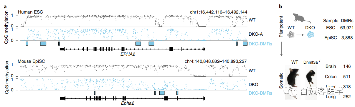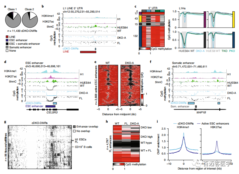 為了探索這種局部調(diào)節(jié)的動(dòng)態(tài)甲基化的保守性,在小鼠表皮干細(xì)胞(EpiSCs)中突變了Dnmt3a和Dnmt3b,因?yàn)樗鼈兇砹伺c人類多能細(xì)胞最接近的發(fā)育和分子類似物。在第4步對WT和DKO細(xì)胞進(jìn)行了WGBS測序,并鑒定了3888個(gè)與人類DKO-DMR具有相似特性的DMR,與82%的推定體細(xì)胞增強(qiáng)子重疊。雖然數(shù)量、√確序列和坐標(biāo)未直接在物種之間map,但小鼠DKO-DMR出現(xiàn)在非常相似的位置且與直系同源基因接近(圖4a)。因此,在體細(xì)胞增強(qiáng)子處甲基化轉(zhuǎn)換的機(jī)制和這些區(qū)域的調(diào)控模式都看起來非常保守。