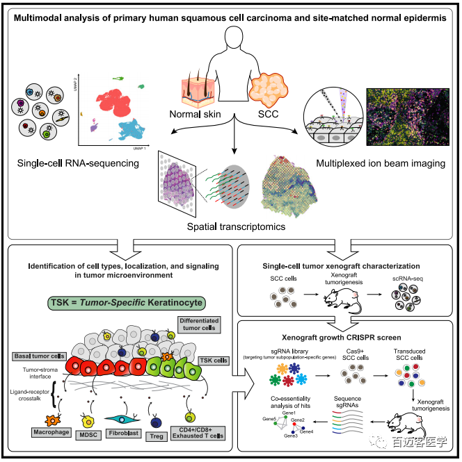 上皮性腫瘤約占人類惡性腫瘤的90%。cSCC作為其中的一種,是美國第二常見的惡性腫瘤,每年發(fā)病人數(shù)超百萬。盡管可以切除治療,但有高達4%的cSCC會發(fā)生淋巴結(jié)轉(zhuǎn)移,并且1.5%的患者最終死亡。近期cemiplimab(PD1抑制劑)的上市給與晚期和轉(zhuǎn)移癌患者以希望,但是腫瘤標志物預(yù)測響應(yīng)的阻力和不足迫切需要更好的對腫瘤微環(huán)境(TME)進行特征描述。本文結(jié)合單細胞測序、空間轉(zhuǎn)錄組等技術(shù),揭示cSCC的腫瘤異質(zhì)性和免疫機制,為腫瘤和免疫動力學(xué)研究提供了支持。