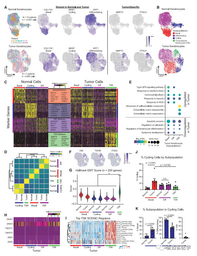 重新聚類正常上皮細胞后,在正常皮膚中觀察到3個主要的角質(zhì)細胞(KC)亞群(基底、循環(huán)、分化細胞)。典型相關(guān)分析表明腫瘤KCs廣泛重現(xiàn)了正常(基底、循環(huán)、分化細胞)亞群,在正常皮膚和cSCC中有幾個共享的標記基因(圖2A-D)。有趣的是,在腫瘤細胞聚類中出現(xiàn)了與正常皮膚無明顯關(guān)聯(lián)的第四個KC亞群,即TSK亞群(圖2B-D)。事實上,在這一簇與其他腫瘤細胞區(qū)別開來的100個基因中,有99個基因在腫瘤組織中的表達明顯高于正常組織。TSK標記基因與細胞運動和細胞外基質(zhì)分解有關(guān),暗示了它的侵入性(圖2E)。TSKs表達經(jīng)典的上皮-間質(zhì)轉(zhuǎn)化(EMT)標志物,如VIM和ITGA5(圖2F);但是EMT類似的TSK細胞缺乏經(jīng)典表達EMT轉(zhuǎn)錄因子(圖2H)。因此,我們通過單細胞調(diào)控網(wǎng)絡(luò)進行推理和聚類,提名AP1和ETS家族成員為潛在控制TSKs的TFs(圖2I)。TSK細胞也表現(xiàn)出較大的EMT評分范圍,提示細胞狀態(tài)具備高可塑性(圖2G),與EMT連續(xù)模型一致?;准毎˙asal)在腫瘤中的發(fā)生率約是正常循環(huán)細胞的四倍(圖2K)??偟膩碚f,cSCC表現(xiàn)出分化失常,基底細胞迅速增殖,并出現(xiàn)表達EMT連鎖基因的TSK亞群。