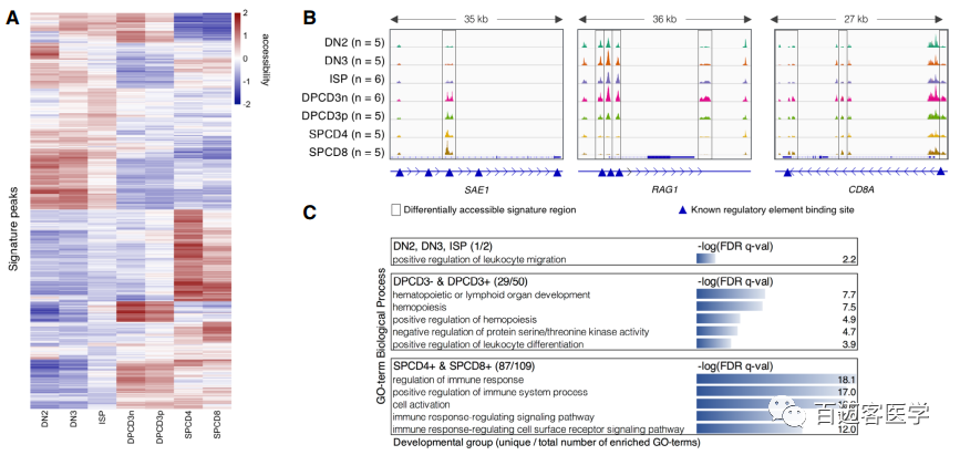 所有特征區(qū)域聚類熱圖將7個(gè)T細(xì)胞類群按其成熟的順序聚集在一起,突出了T細(xì)胞成熟過(guò)程中染色質(zhì)可及性的持續(xù)變化(圖2A)。連續(xù)發(fā)育階段的逐漸變化導(dǎo)致了DN3和ISP之間的輕度分離,雙陽(yáng)性階段CD3–和CD3+(圖2A)導(dǎo)致在使用CIBERSORT反褶積算法預(yù)測(cè)細(xì)胞類型預(yù)測(cè)精度不理想。利用主成分1和2的轉(zhuǎn)換,量化了特征OCRs的重要性并發(fā)現(xiàn)SUMO1激活酶亞基1上有一個(gè)峰(圖2B)。此外,OCRs差異可及性附近有階段性特征已知基因如CD8A和RAG1/2(圖2B)。雙陽(yáng)性組OCRs在與造血和白細(xì)胞分化相關(guān)的terms富集,單陽(yáng)性組在免疫系統(tǒng)調(diào)節(jié)相關(guān)的terms富集(圖2C)。然而,雙陰性特征峰只富集在一個(gè)GO-term即白細(xì)胞遷移正調(diào)節(jié)(圖2C)。