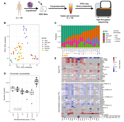 29個(gè)PDX模型中有7個(gè)對(duì)應(yīng)19個(gè)T-ALLs患者中的4個(gè)(圖4A),之前被證明可以再現(xiàn)原發(fā)性白細(xì)胞樣本的染色質(zhì)可及性,與原始患者相比,ATAC文庫(kù)富集在TSS區(qū)域。白血病樣品2,823個(gè)細(xì)胞特征OCRs PCA分析顯示與健康T細(xì)胞分離,將其定位在早期DN2和DN3&ISP發(fā)育階段附近(圖4B)。19例白血病患者中16例早期發(fā)育組DN2和DN3&ISP至少占40%(圖4C)。值得注意的是,即使是被免疫表型分類為成熟的T-ALLs也表現(xiàn)出早期DN2染色質(zhì)可及性概況的實(shí)質(zhì)性貢獻(xiàn),表明即使是以成熟免疫表型為特征的T-ALL亞型也類似于未成熟的胸腺前體(圖4C)。通過(guò)ATAC-Seq peaks數(shù)量衡量,染色質(zhì)可及性隨著T細(xì)胞的成熟而降低(圖4D)。雖然T-ALLs與早期DN2群體最相似,但是T-ALLs的peaks數(shù)明顯高于分類后的T細(xì)胞群(圖4D)。132個(gè)早期特異性TF結(jié)合位點(diǎn)如Bach1/2、Maf和Nfe212,109個(gè)在白血病中顯著富集,然而115個(gè)中間和成熟特異性TFs中只有12個(gè)在T-ALLs中富集(圖4E)。在T細(xì)胞白血病中,以正常DP和SP階段為特征的TFs結(jié)合位點(diǎn)motifs趨向減少(圖4E)。