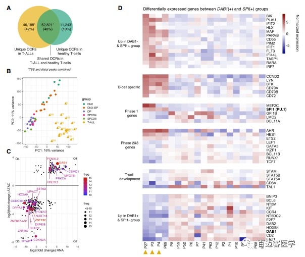 由于患者異質(zhì)性較高(圖5B),作者對(duì)每個(gè)患者進(jìn)行了DESeq2差異分析鑒定復(fù)發(fā)事件。與健康T細(xì)胞前體相比,作者在至少5個(gè)T-ALLs中鑒定出292個(gè)差異基因和差異可及性O(shè)CRs(圖5C)。102個(gè)峰/基因可及性強(qiáng)并過(guò)表達(dá),191個(gè)峰/基因可及性弱并低表達(dá)(圖5C)。4例未表達(dá)DAB1的患者(P3、P4、P27和P69)形成了一個(gè)不同的亞群其特征是SPI1過(guò)表達(dá),發(fā)育早期DN2貢獻(xiàn)率特別高(圖4C),3例患者TF SPI1(PU.1)結(jié)合位點(diǎn)可及性更高(圖4E)。基因表達(dá)和染色質(zhì)可及性差異分析顯示,表達(dá)SPI1的患者以基因過(guò)表達(dá)/超可及性為特征,并決定了T細(xì)胞發(fā)育的早期第一階段。這些基因包括MEF2C、MEIS1和HOXA9 ,基因特征為B細(xì)胞前體如LYN、BTK、cyclin D2、CD79A、CD79B和CD72(圖5D)。DAB1過(guò)表達(dá)和超可及性T-ALLs趨向于T細(xì)胞發(fā)育后期2和3階段過(guò)表達(dá)基因如TCF7、LEF1和RUNX1(圖5D)。綜上所述,這些數(shù)據(jù)涉及到DAB1和SPI1一個(gè)未知的相互排斥的生物學(xué)意義,并將T細(xì)胞發(fā)育階段,即兒童T- ALLs可能起源于成熟T細(xì)胞發(fā)育途徑的不同層次,盡管早期水平始終一致。