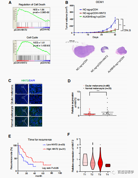 在眼黑色素瘤細(xì)胞中,在mRNA水平和蛋白水平均過表達(dá)HINT2。發(fā)現(xiàn)過表達(dá)HINT2后,眼黑色素瘤細(xì)胞的細(xì)胞增殖、細(xì)胞遷移、和克隆形成明顯受到抑制,細(xì)胞凋亡增加。此外,GSEA顯示在腫瘤細(xì)胞中HINT2促進(jìn)凋亡和細(xì)胞死亡(Fig3a)。為了確定HINT2在體內(nèi)腫瘤特征中的作用,過表達(dá)HINT2的眼黑色素瘤細(xì)胞進(jìn)行了皮下移植。結(jié)果顯示:相對(duì)于對(duì)照組(Fig3b, A組)來說,實(shí)驗(yàn)組HINT2過表達(dá)組(Fig3b, B組)腫瘤體積持續(xù)降低。為了研究這些蛋白表達(dá)的變化是否在樣本中發(fā)生,在眼黑色素瘤和正常組織中進(jìn)行IF實(shí)驗(yàn)(Fig3c),發(fā)現(xiàn)HINT2確實(shí)在腫瘤樣本中下調(diào)。除此之外,在眼黑色素瘤組織樣本中,低表達(dá)的HINT2與不良預(yù)后高度相關(guān)(Fig3e)。