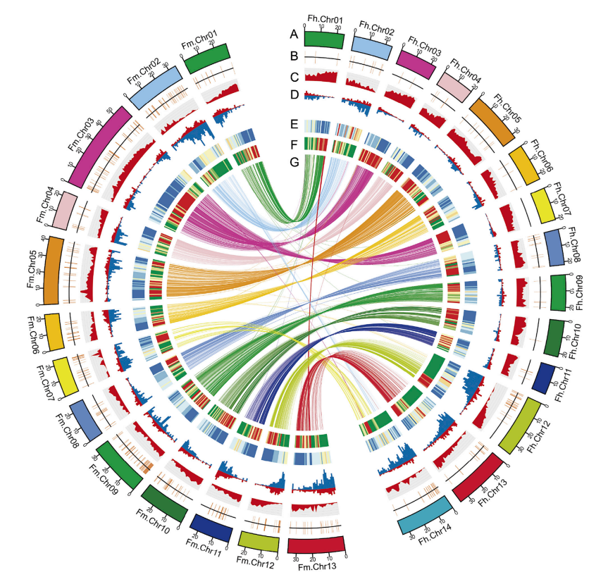 兩種榕樹基因組比較發(fā)現(xiàn)有大量結(jié)構(gòu)變異,細(xì)葉榕的3號染色體FmChr03,與對葉榕3號及7號染色體(FhChr03、FhChr07)發(fā)生融合或裂變事件,重排區(qū)內(nèi)的基因富集顯示主要與植物免疫功能有關(guān)。兩種榕樹在真雙子葉植物的三倍體事件之后,均沒有檢測到全基因組復(fù)制(WGD)事件。全基因組比對分析表明,兩個榕樹基因組共有約38Mb 片段重復(fù)(SDs),表明SD是基因組規(guī)模擴(kuò)大的主要因素。