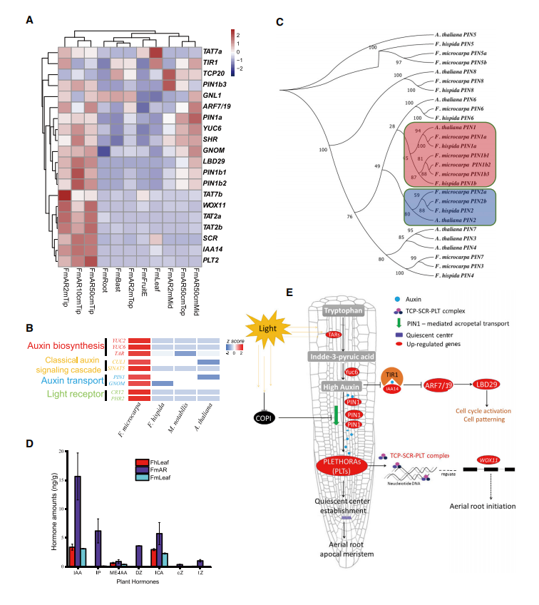 細(xì)葉榕與對葉榕顯著差異表現(xiàn)為前者有氣生根而后者沒有,為了尋找觸發(fā)氣生根的途徑,作者在氣生根尖鑒定到811個高表達(dá)基因。這些高表達(dá)的基因在一系列與運(yùn)輸相關(guān)的生物過程中顯著富集。通過對PIN家族的系統(tǒng)發(fā)育分析,發(fā)現(xiàn)PIN1基因存在顯著的拷貝數(shù)變異(CNV),并確定了兩個進(jìn)化的PIN1亞群。第一組(PIN1a)在兩種榕樹和擬南芥中均被鑒定到,第二組(PIN1b)僅于兩種榕樹中。RNA-seq表明,FmPIN1a在大多數(shù)被測組織中均有表達(dá),而FmPIN1b1、FmPIN1b2和FmPIN1b3在氣生根樣品中高表達(dá)。光受體CRY2和PHR2的拷貝數(shù)增加,TAR(如TAT2a、TAT2b和TAT7b)和YUC編碼基因(如YUC6)的表達(dá)增加進(jìn)一步加速了IAA的積累,與對葉榕相比,細(xì)葉榕氣生根尖的內(nèi)源生長素濃度高出5倍。說明生長素的增加引發(fā)了氣生根的發(fā)育,光促進(jìn)的生長素依賴途徑與氣生根的發(fā)生、生長和形態(tài)形成有關(guān)。