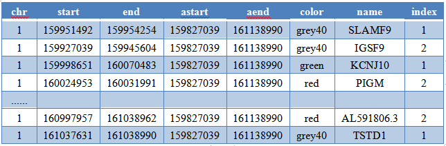 首先用你能用的辦法將目標(biāo)區(qū)域(1:160000000-161000000)內(nèi)的基因、目標(biāo)區(qū)域上游的兩個(gè)基因、目標(biāo)區(qū)域下游的一個(gè)基因的位置都提取出來,然后為每個(gè)基因賦一個(gè)顏色。中間灰色的bar兩端的突出可以從第一個(gè)基因的開始位置向上游擴(kuò)100K、最后一個(gè)基因的結(jié)束位置向下游擴(kuò)100K。整理成作圖用的輸入文件,如下: