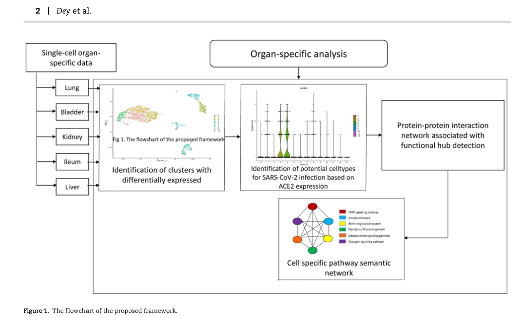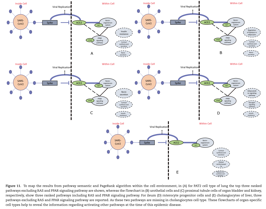 血管緊張素轉(zhuǎn)換酶2(ACE2)作為COVID-19的特異性受體在宿主細(xì)胞中發(fā)揮著重要作用,從而使得新冠疫情大流行。與特異的肺泡II型細(xì)胞相比,ACE2在膀胱、回腸、腎和肝臟中相對的高表達(dá)。在本研究中,通過對五個組織的單細(xì)胞測序識別出ACE2高表達(dá)的細(xì)胞類型;隨后,構(gòu)建蛋白質(zhì)-蛋白質(zhì)互作網(wǎng)絡(luò)(PPIN),以識別形成功能性中心節(jié)點(diǎn)的潛在生物標(biāo)志物。經(jīng)研究發(fā)現(xiàn),腎素-血管緊張素系統(tǒng)和PPAR信號通路對加強(qiáng)新冠病毒感染具有重要作用,本文也顯示出PPAR蛋白家族在功能性中樞節(jié)點(diǎn)中起到重要的作用。為理解潛在標(biāo)志物的功能,通過構(gòu)建通路語義網(wǎng)絡(luò)研究相關(guān)的通路,隨后,對識別出的通路用PageRank算法進(jìn)行排秩;接著,這些通路網(wǎng)絡(luò)也由一些基本的代謝通路所構(gòu)成,比如胰島素抵抗通路等。經(jīng)過一系列的研究表明,血管緊張素和PPAR蛋白質(zhì)家族可以認(rèn)為是新冠患者可能的治療靶點(diǎn)。