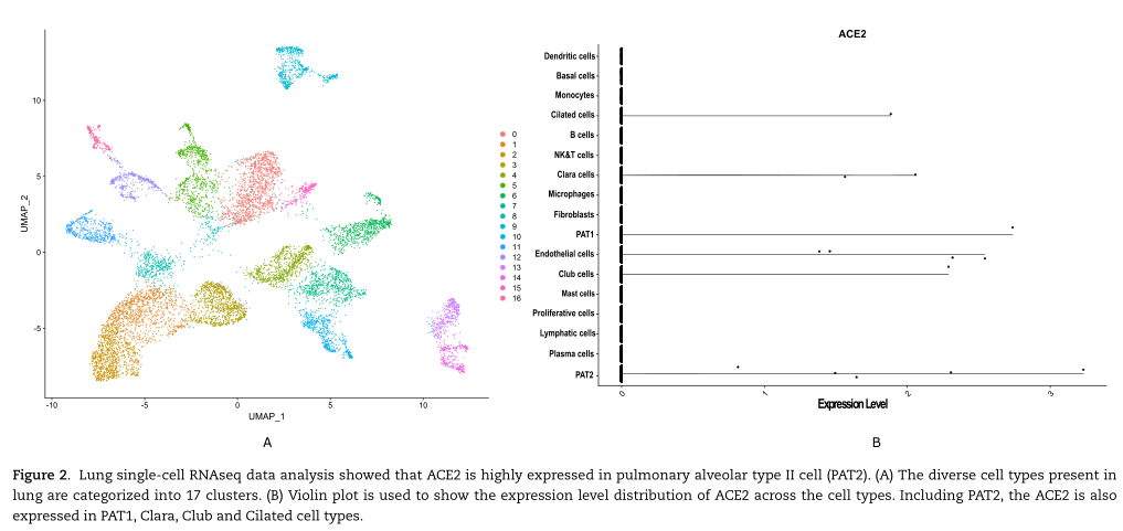 由于ACE2、AGT和PPARA在PAT2細(xì)胞中顯著表達(dá),因此PAT2細(xì)胞可作為肺組織的潛在的與新冠病毒感染的細(xì)胞。ACE2表達(dá)水平的表達(dá)圖提示肺對病毒血癥具有高度的易感性。然而,該研究也鑒定了兩種不同的細(xì)胞,即漿細(xì)胞和肥大細(xì)胞。在漿細(xì)胞中,三種轉(zhuǎn)錄均顯著表達(dá),而在肥大細(xì)胞中,AGT和ACE2顯著表達(dá)。