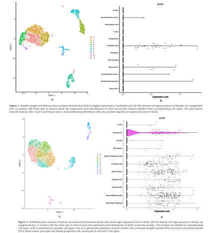 在膀胱中,ACE2與尿路上皮細(xì)胞有較高的親和力,如Figure 3所示。與PPARA不同,來自PPAR家族的PPARG表達(dá)水平顯著。從腎臟來看,ACE2在近端小管細(xì)胞和平滑肌細(xì)胞中表現(xiàn)出更高的親和力(如Figure 4所示)。