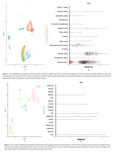 回腸和肝臟是代謝系統(tǒng)的一個區(qū)域,兩個器官都有ACE2陽性的上皮樣細(xì)胞。在回腸中,腸上皮細(xì)胞和纖毛上皮細(xì)胞有顯著表達(dá)ACE2, AGT和PPARA(Figure 5),但是,F(xiàn)igure 6中顯示相對于其他器官,這些細(xì)胞表達(dá)水平相對較低。類似地,膽管細(xì)胞是主要存在于肝組織中的一種上皮細(xì)胞。在這些細(xì)胞類型中,ACE2、AGT和PPARA標(biāo)記物的表達(dá)值較高。