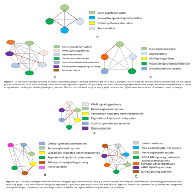 考慮到每一途徑的生物學(xué)過程,本文構(gòu)建了語義相似度圖。ACE2在三種不同類型的肺細(xì)胞中均有高表達(dá),研究中分別在Figure 7A、B和C中給出了Mast、PAT2和漿細(xì)胞的通路語義網(wǎng)絡(luò)。在膀胱中,ACE2在一種特殊的細(xì)胞類型中表達(dá),即尿路上皮細(xì)胞(如Figure 8A所示)。而在腎臟中,ACE2的近端小管細(xì)胞(如Figure 8B所示)和平滑肌細(xì)胞(如Figure 8C所示)表達(dá)率較高。在回腸細(xì)胞類型,如纖毛上皮細(xì)胞(如Figure 9A所示)和腸上皮細(xì)胞祖細(xì)胞(如Figure 9B所示)顯示ACE2的顯著表達(dá)水平。與膀胱器官相似,ACE2在肝臟中表達(dá)于一種特殊的細(xì)胞類型,即膽管細(xì)胞(如Figure 9C所示),ACE2表達(dá)水平顯著。在通路語義網(wǎng)絡(luò)圖中,節(jié)點(diǎn)表示一條特定的路徑,加權(quán)邊定義兩條路徑之間的相似度值,刻畫共享生物過程的最大數(shù)量。